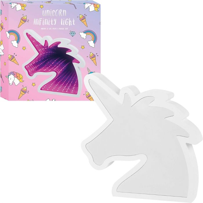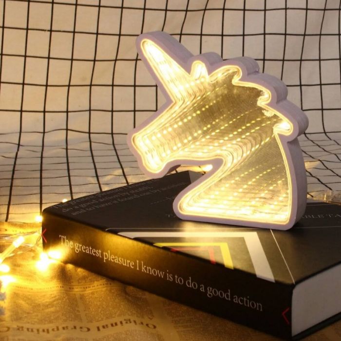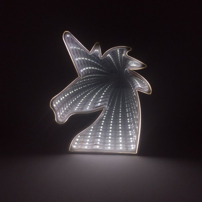 Lampara led blanca con forma de unicornio. Espejada genera un efecto infinito.